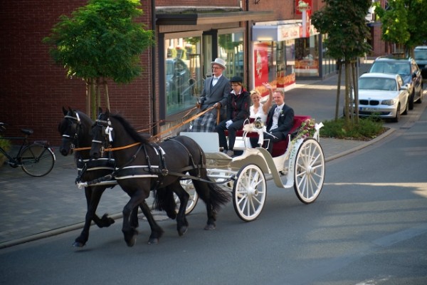 … wie in der „guten alten Zeit“ mit Pferd und Wagen und Hochzeitgesellschaft vor dem Traualtar. Wir fahren Sie an Ihrem Hochzeitstag gemeinsam mit Ihren Trauzeugen mit ruhigen, schönen Friesengespannen und versichern Ihnen, dass diese Fahrt ebenso wie der ganze Tag ein unvergessliches Erlebnis bleiben wird. Unser Fahrbereich liegt bis ca. 25 Km um Schöppingen!!